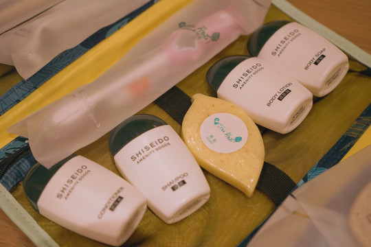 最最喜欢的还是他们家的洗漱包,超级无敌贴心呐!里面的洗发水、沐浴露等洗护产品都是资生堂的,也太高级了吧!牙膏是皓乐齿的,还准备了一片面膜啊…