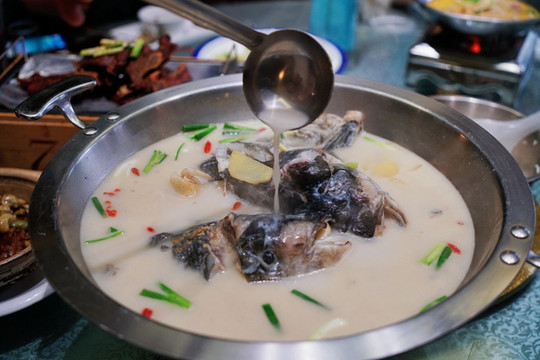 7071的总店就在 建德 ,这里的风味更加地道和本土化!“墙裂”推荐:奶汤鱼头、生炒鸡、爆辣鸭掌堡、野菜地衣、火腿芦蒿。特别提下奶汤鱼头,超大的奶香鱼头汤,鱼肉香嫩,汤头鲜美,可口美味,分量十足,适合6~8人!