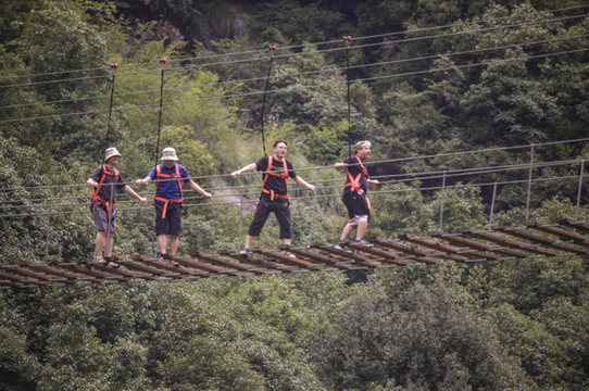 走上铁索桥,在铁索桥上摇摇晃晃的感觉非常刺激。无论是两边还是脚下,都是悬空,每踏出一步,走过每一块木板,确实都有步步惊心的刺激感。
