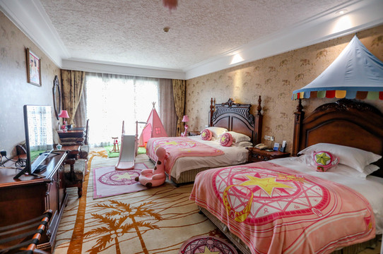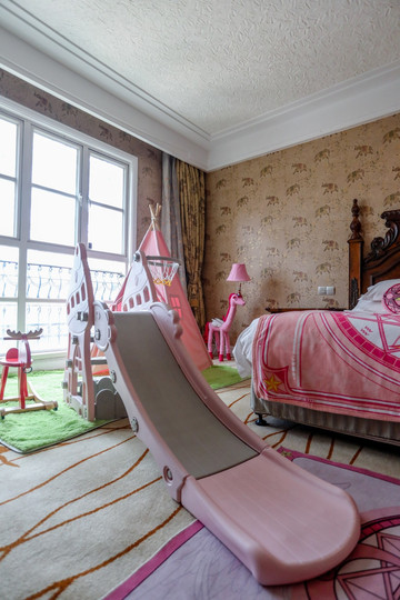 而且亲子房除了床单和布置全部换成了亲子装饰外,还摆放了可爱的小玩偶,还有滑梯、帐篷灯小朋友喜欢的设施,非常有爱。