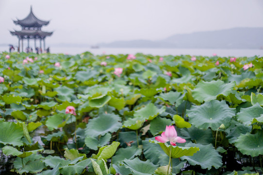 正好夏季,湖边荷花盛开,遮天荷叶无穷碧的景致加上粉红的荷花,就是夏日西湖的美景。