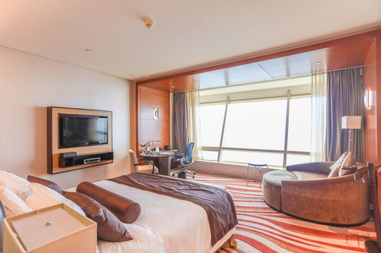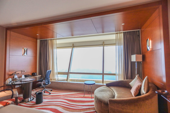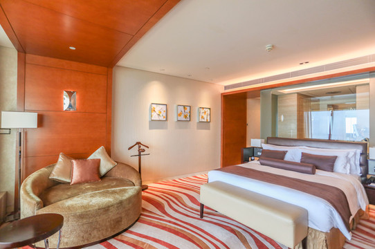 房间用了落地玻璃的设计,窗户外就是钱塘江的美景,在房间就能看到千帆过尽的景象。而且大床的设计也是直接面对着窗户,即使是躺在床上也能看到钱塘江的美景。而且窗边还放置了一张圆形的懒人沙发,躺在沙发上,泡一杯西湖 龙井 ,这样的下午也格外休闲。