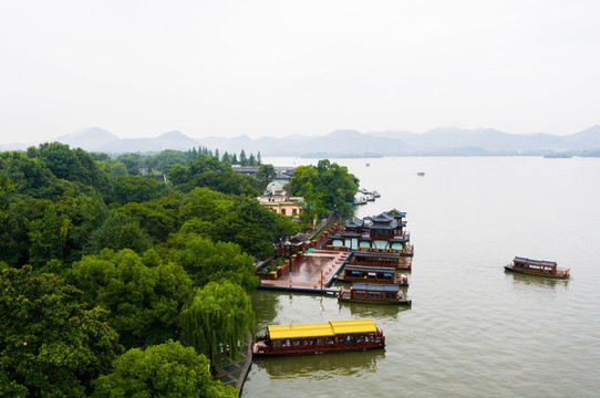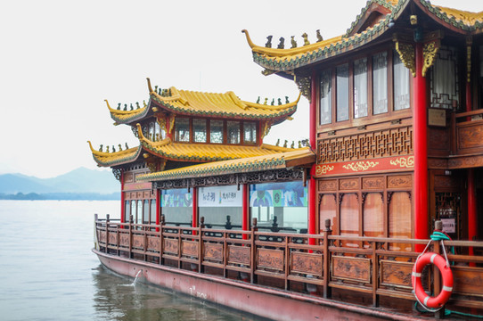 在湖边有很多的游船画舫,如果不想步行也可以坐上游船,去游览西湖的美景。