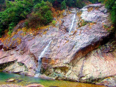 继续再往峡谷中走,只见随着河滩越来越险峻,景致也越来越美丽,溪瀑风光主要集中在这一段,前面飞溅而下的瀑布便是灵曲双瀑,灵曲瀑布长约30米,顺着岩壁流淌,下雨时,本来只有一条的瀑布,中途被岩石阻挡,一部分瀑布溅起扇形的水帘,飞舞在空中,另一部分瀑布折向旁边,偏离原来的位置继续垂挂下来,气势灵动、壮观而曲折有致,所以称作灵曲双瀑。