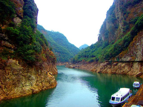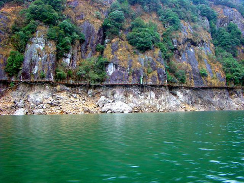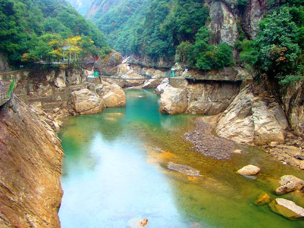 峡谷中时而会出现一些栈道,这是先从河底用杉木搭成架子后,再在岩壁上凿洞、搭木而成。《三国演义》中有一个典故叫“明修栈道,暗渡陈仓”,指的就是这样的栈道。此外还有小桥连接着峡谷两边,便于游客随心所欲地畅游于峡谷中。