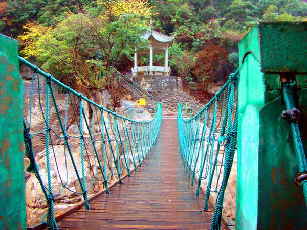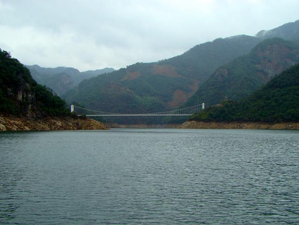 这座桥称为仙渡桥,全长186米,宽2.4米,是浙江省最长的人行铁索桥。铁索桥使风景区形成了一个陆上环线,它的左边是王家染农业观光区,右边是浙江红色革命老区--山洋村。对面山上岩石林立,就是当年的天兵坡。望着碧水之上由远而近的仙渡桥,不由得脑海中就涌现出毛泽东的诗句:“一桥飞架南北,天堑变通途,高峡出平湖”的意境。