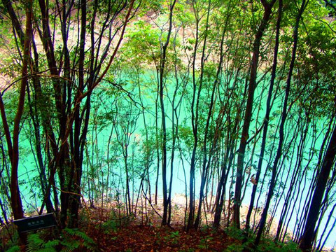 在峡谷中的小道行进中,耳边溪流拍石涌动的声音始终不绝于耳。透过稀松的枝叶低头看峡谷水色,这一带的水面水域大小适中,非常适合看水中倒影。远处波光鳞鳞、近处山色倒影,岸边危石百尺,山中树木葱茏,风光十分秀丽。