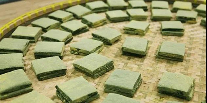 掺着青制作的青麻糍。大多切做菱形,两面蘸以松花粉,内黄外青。食麻糍时,烘煎随便,蘸以白糖,香味俱佳;如用火缸煨之,则别有一股乡村风味。