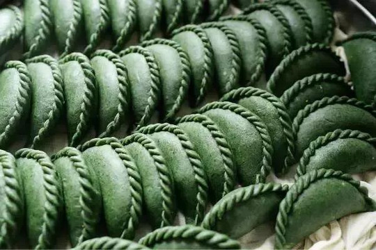 将青混入饺子皮,整整齐齐的边,赏心悦目。