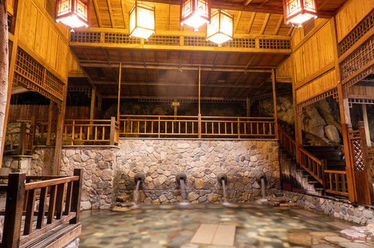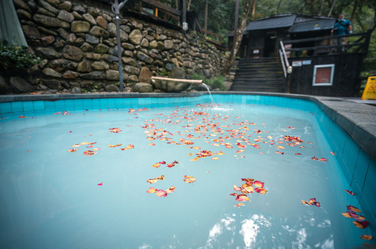 温泉池一般都在山坡上,此处也一样,一个一个小池子零星散布,加的料也不同,有美容养颜的/有中草药的/有滋补的/有鱼疗池/有玫瑰花池等等,泉水是重碳酸钠水质,对心血在管和皮肤都很有益,大大小小二十来个,每个池子间间隔也挺大的,基本不会看到别人的身影。中间还有一处供给,泡饿了还可以来吃点东西,冬天还有免费的姜汤可以喝。