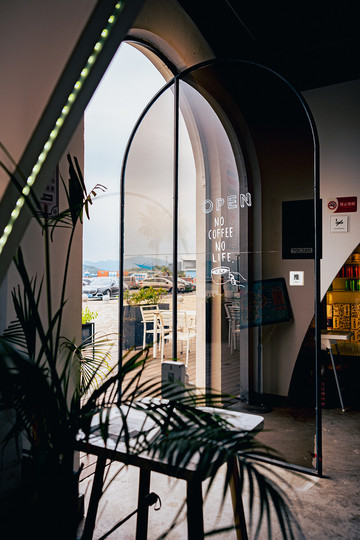 咖啡馆用了很多圆拱形的设计,非常时尚,通体白色,里面的桌椅也大多为白色,几棵绿植的点缀,拍照做前景恰到好处。