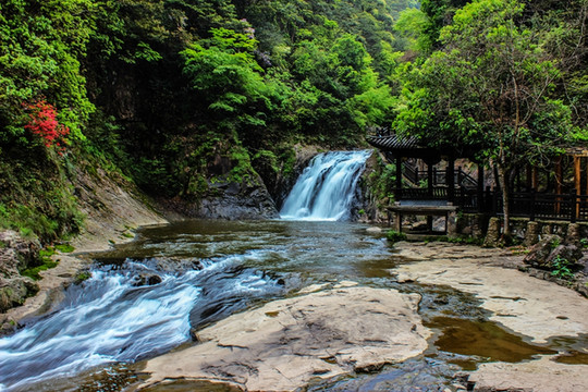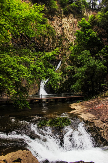 从北门到第一泄很近,十分钟。五泄瀑布第一泄处,五泄以其神态奇特,变幻莫测的飞瀑闻名于世,五级瀑布总长334米,落差80.8米。