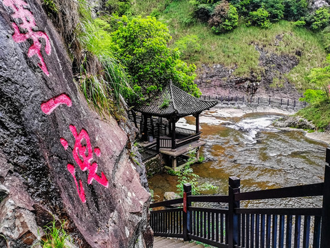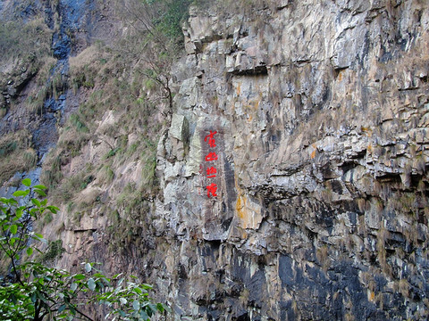 第三泄旁的悬崖上有“秀幽极险”四字的摩岩石刻。