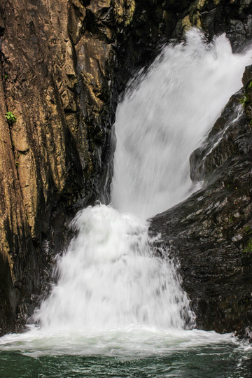 二泄紧接一泄,落差为7.1米,瀑布下落时,被一块兀石分成两半,第二泄分流如珠帘飘动,开朗而又深沉,又如双龙出游不知天高地厚。