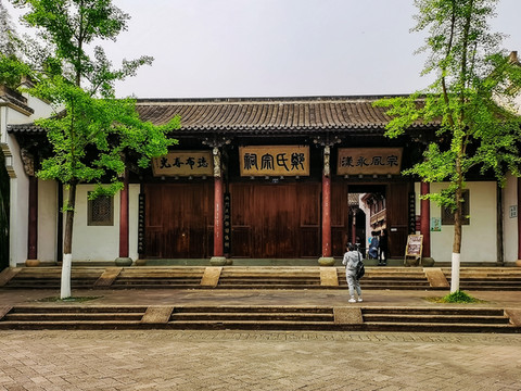 范蠡祠,全部建筑由范蠡祠及财神庙、魁星阁、三星庙等相关建筑组成。范蠡祠面西南背靠金鸡山,气势恢宏,采用清代民间建筑风格,黛瓦粉墙,古朴典雅,带有浓郁的江南民间建筑艺术特色。诸暨是范蠡出道的地方,并在此生活12年。范蠡为中国早期商业理论家,楚学开拓者之一,被后人尊称为“商圣”。