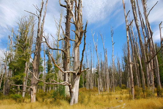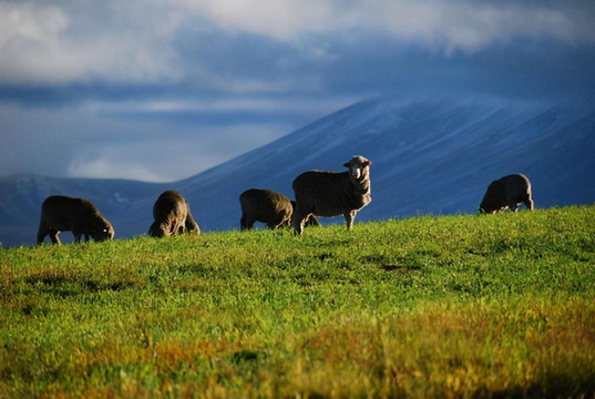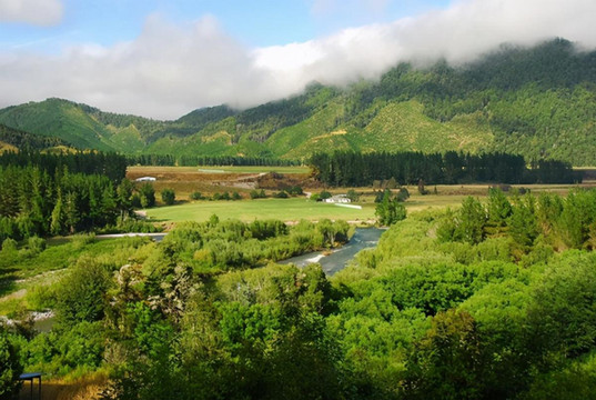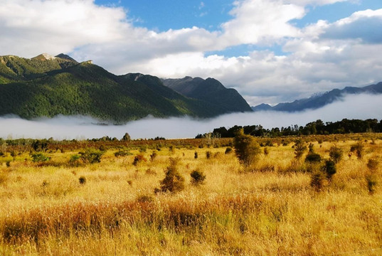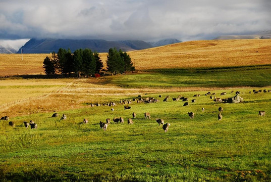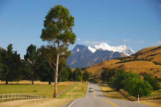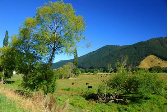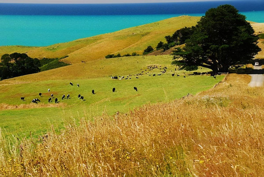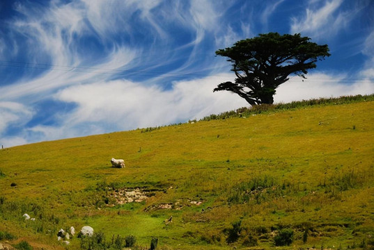 新西兰不大,但因只有五百万人口,因此显得幅员辽阔。开车十公里见不到人是常事,见不到车也不稀奇,十公里笔直的路也时有发现。大片的土地虽然荒芜着,但却并不苍凉,只见草海翻滚,林海起伏,绿色、金色交替着从眼前飘过。