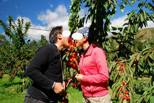 在从WANAKA去皇后镇的路上,我们途经了一个车厘子农场,可以自采车厘子。这里有五、六种品种,有粉红、深红、黑色,可站在地上或爬上架子采摘,任吃,吃够了再去称,合每斤25元人民币。这里的车厘子是我们有生以来吃到的最好品种,细腻、多汁、超甜,因为是第一次,又是在异国他乡采摘车厘子,每个人都很兴奋,吃到高兴处,忍不住俩俩相依在车厘子树下留下了一对对浪漫情侣照片,取名“红樱桃”之恋恰如其分!正所谓物质第一,精神第二。结束采摘,我们平均每家买了六公斤车厘子,大大超过农场主的想象,按规定,每家必须至少买二公斤。他哪里知道,我们这些饿狼,只买二公斤还不够塞牙缝呢!我们两天就将其全部解决了。后来大家打趣,方圆六百公里内,如果还有这样的农场,我们可以考虑专程再去。
