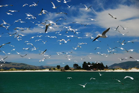 在最后一站AKAROA,我们去感受了一次与海豚游泳,价格很贵,每人150纽币,但对于热爱动物的人们来说,人生难得有这样几次,还是值得的。我们乘游轮来到深海上,然后停下来,工作人员开始制造各种噪音吸引海豚,那些大自然的精灵十分好奇,很快就会游过来一探究竟,它们跳跃、翻滚,在我们中间穿梭,与我们擦身而过,近在尺尺,我们兴奋的尖叫与海豚悦耳的歌声遥相呼应,相映成趣,共同谱写一曲“欢乐颂”。