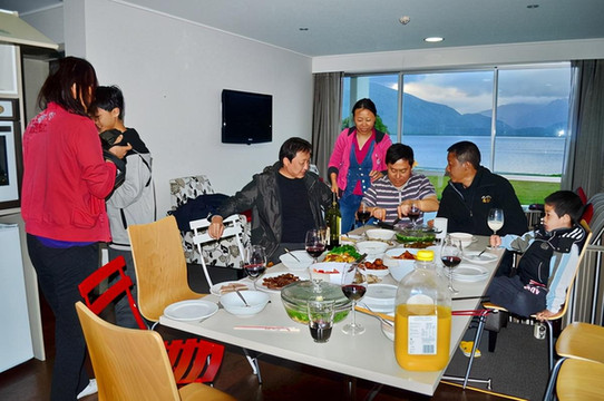 大年三十,我们去米尔福德峡湾(Milford Sound),并参观沿途风光,回到蒂阿瑙(Te Anau)就开始马不停蹄自己准备团年饭,各路高手各显神通,按照俗套,呈上一桌十菜一汤的大餐,举杯遥祝祖国新年快乐。这是第一次在海外这么多朋友一起过三十,别有风味。特别提一句,下厨的都是男士,看来男女平等还是遥遥无期啊!