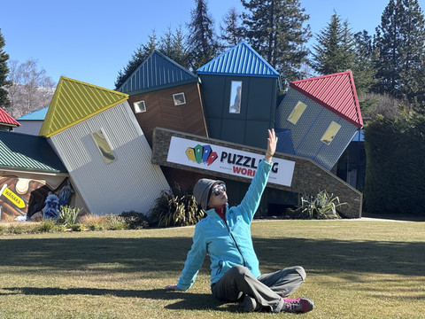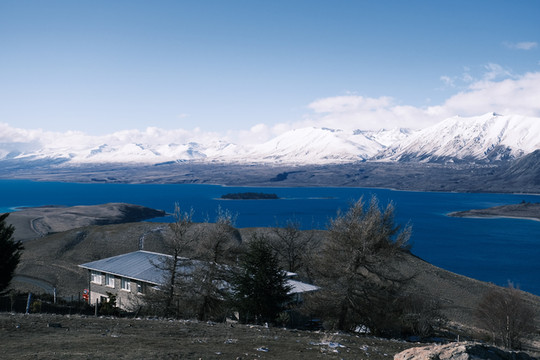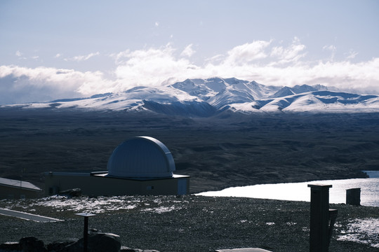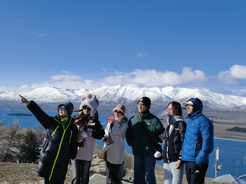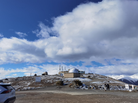 湖边玩了个尽兴后,司导开着车把我们带到了山顶,每辆车需要付八刀的停车费。山顶处海拔也就1千米,居高临下,望着整个蒂卡波湖,视野更开阔,风景更好,风也更大。山顶有一个咖啡屋,是网红打卡地,也是避风驱寒的绝佳处,咖啡和甜点也不贵,值得在里面点杯喝的缓一缓,取个暖。山顶还有好几个圆形的天文台,估计是晚上游客过来参加观星活动的。山顶的风这么猛烈,我裹成个球还嫌冷,居然还有老外穿着短裤,真是服了。