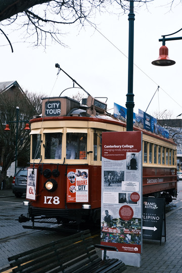 雨一直下,漫步在基督城的街道上,有些阴冷。主打复古怀旧风的红色小电车缓缓驶过,车上乘客稀少,毕竟乘坐一圈也要不少钱,我们还是选11路了。