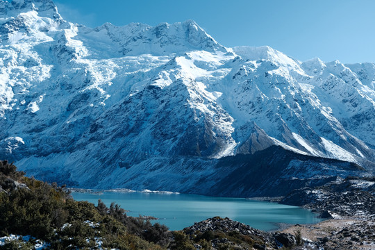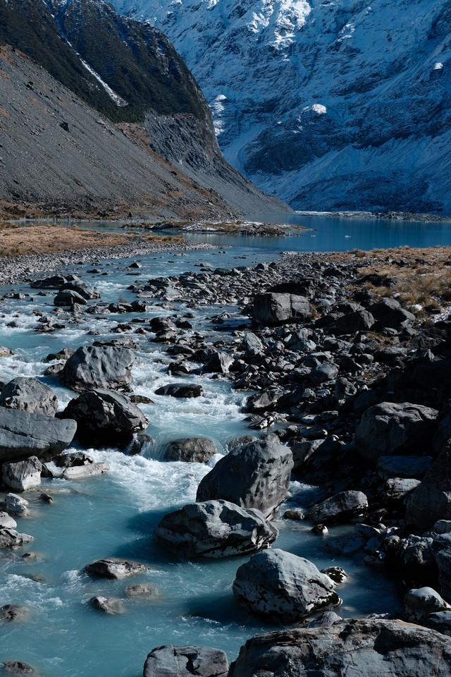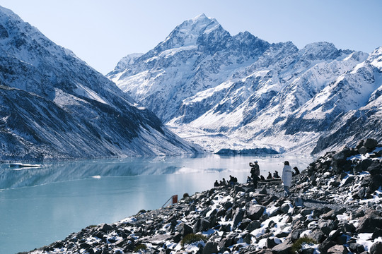 当然如果有时间,肯定要往里走,美景藏在深山中。途中我们走走看看,拍拍停停,一路上经过三座吊桥,大约花了两个半小时走到了第2个冰川湖,在库克峰下的库克湖 lake hooker,这中间有一个厕所。第2个冰川湖更为壮观,四周的山体几乎全部被冰雪覆盖,湖面呈现奶绿色。在阳光的照射下,只有一小部分湖面解冻了,呈现出波光粼粼的样子,而很大一部分湖面依然冰冻住,湖面上有很多大块的浮冰,仿佛在南极一般。如果你此刻摘下墨镜,会觉得冰天雪地让你睁不开眼,但又会觉得真实的世界就是如此酷炫。这冰冻的凝固的美让人窒息,此刻不需要语言,瞬间让我想起了纪录片《冰冻星球》,思绪也刹那间穿越到《泰坦尼克号》杰克和柔丝最后分别的场景。