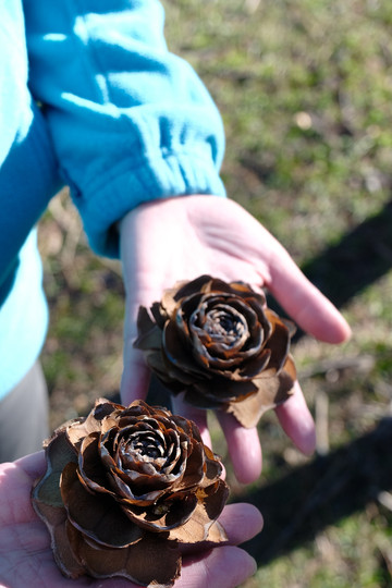 往前再走不久,也有很大一片树林,里面种植着各种玫瑰花和树木,只是现在冬季,显得很萧瑟。司导给我们捡来两个松塔,居然是玫瑰花形状的,也太好看了吧。这棵松树来自尼泊尔,这边有很多来自不同国家和不同品种的松树,我们决定把它带回家。