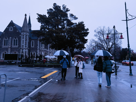 原计划今天早晨9点出发,可是拉开窗帘,外面一直在下雨,雨下的不小,所以大家一直磨磨蹭蹭,直到9:30才出门。由于下雨想着坐公交不方便,所以改成了优步打车,大约23刀一辆车。基督城面积不大,所以今天我们采用City walk的方式来探索这座城市。基督城的建筑很有特色,随便在街上逛逛也是一种艺术的享受。