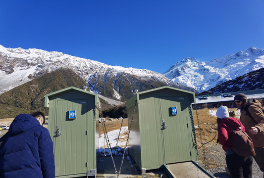 大约行驶了四、五十分钟,我们来到库克山国家公园门口。因为是冬天,厕所已经关闭,只有几个移动的旱厕,没办法,大家挨个排队上厕所。新西兰的公共设施都很不错,哪怕是这样一个移动厕所,里面也有厕纸,而且打扫的很干净,只是没有洗手的地方,最好自带湿巾纸。
