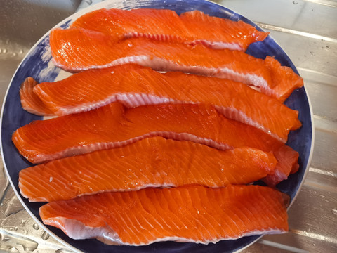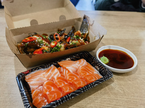 返程时我们又一次来到昨天吃三文鱼的地方,没想到临近下班时间,柜台里面空空如也,我们只能买了一些自己回去做。我们选的这一包都是鱼肉,但是带有一些鱼刺,这么一大盆才14刀,是不是超级划算,晚上我们来了个三文鱼两吃,刺身和煎制各来一盆,大家都吃到爽。