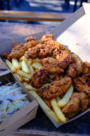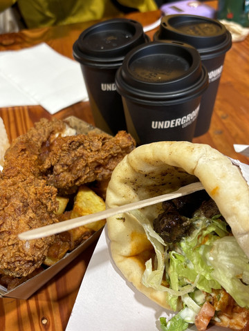 我们仨点了一份炸鸡土豆,一份牛肉希腊卷饼,又在一家帅哥的店里点了三杯咖啡,大约50刀。这个炸鸡是我们在整个新西兰旅行中吃到最好吃的,大家不要错过。卷饼里的牛肉分量也很足,只是帅哥家的咖啡不收现金,只能刷卡,不晓得为啥我的visa卡刷了两次都失败,最后终于刷了银联卡得以成功。