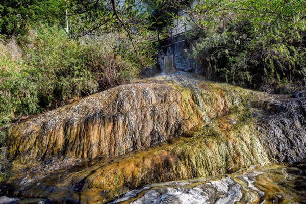 此外,在路边还能看到不少五彩斑斓的岩石,这些石头是因为温泉水的不断冲刷,而温泉水在流动的过程中温度也随之下降,钙、镁、硫等多种矿物离子的溶解度也跟着下降并析出,最后附着在岩壁上,从而形成了多彩的褶皱沉淀物,这便是“泉华裙”,这些泉华裙还根据成分的不同作出细分,总之看上去都十分神奇。