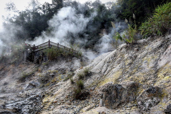 当然,最神奇的温泉在最顶上,这汪温泉直径为3米多,深度则是1.5米,终年冒着97℃的沸水,不仅蒸汽冲天,还伴随着沸水的轰鸣。如果仅仅是这样的话,那还不足以称奇,这汪温泉与其他温泉比起来更具有“实用性”,当地人会利用泉边的出气孔蒸煮红薯、土豆等食物,不消半小时即可食用,同时还能在温泉里煮鸡蛋,基本是立等可食,正是由于用它烹饪食物,因此这汪温泉也被称为“热海大滚锅”,成了景区内最出名的景点。