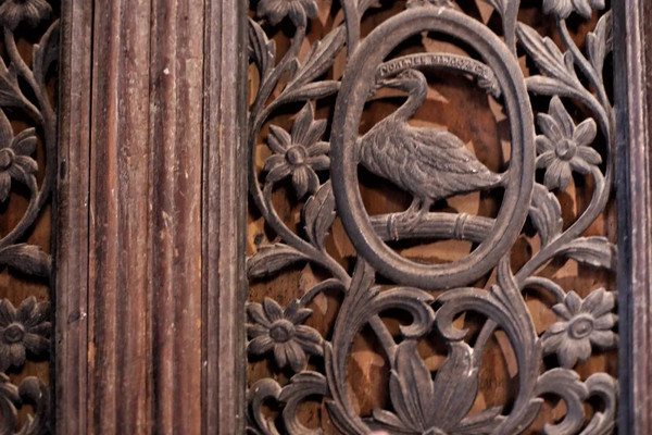 我们注意到,楸木的花窗上还有闪闪发光的金色。福盛隆的负责人说,中间黄色的是鎏金的金粉,是缅金,含有一定的金的含量,但不是纯金。