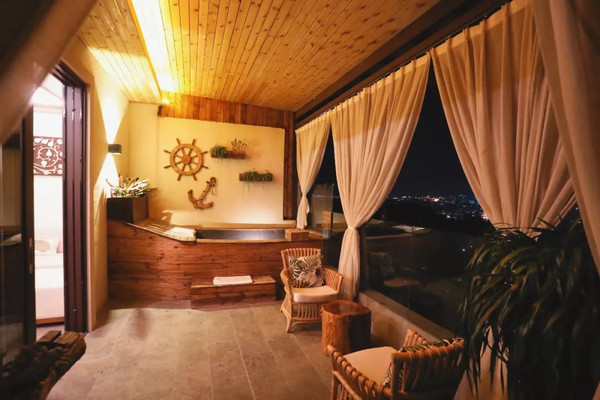 阳台的温泉池是一艘船的造型,随时都可以使用,而且是真的地热温泉,对身体和肌肤都很好。
