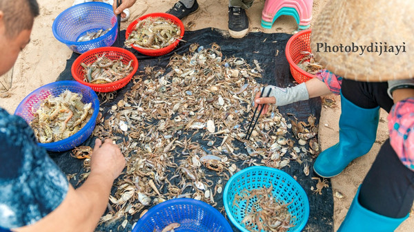 到了岸上,将鱼虾蟹分类,找出可以吃的食材,有些小虾米就送给渔夫了,我们自己带回了蟹和皮皮虾