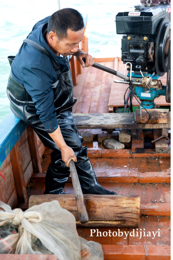 找到适合的海域后,就开始将网撒入海中,等待鱼虾们入网,这个过程中渔夫还会用木棒敲击,发出声响,我个人觉得是为了驱赶鱼虾入网,不知道理解的对不?