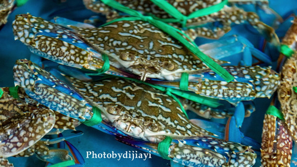 算了下晚餐的量,感觉还差点,就去中午的市场又买了几只蟹,凑个一盘,原来这种花蟹没煮之前是蓝色的,我还是第一次见。