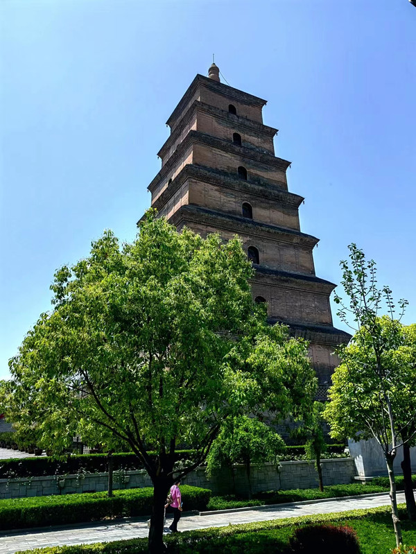 第一天落地西安就是中午,我们办了入住就从酒店步行到陕博,为了节约时间在路上顺路吃的,没想到遇到一家特别好吃的面馆,大碗的面,料很足,味道非常赞,价钱也合适,来到西安的第一印象满分。到陕博之后出示手机上的订单信息进门,然后就排队约讲解。陕博必须要约讲解,否则啥也看不懂。讲解是10人300元,我们6个人,本来想就这样吧,结果过来两个人要和我们拼团,最后正好凑成了10人,于是大家均摊费用,非常合适。逛完出了展厅,很累,这个时候时间大约是下午4点多,如果想去大雁塔就得马上出发,否则就关门了,如果不急着进那个慈恩寺(大雁塔在慈恩寺里),建议可以回宾馆休息1个多小时,然后再去大雁塔景区,虽然进不了寺院,但是景区也是很漂亮的。我们当天没有经验,就坐在陕博的廊下座椅上休息了一个小时,然后步行到大雁塔北广场。
