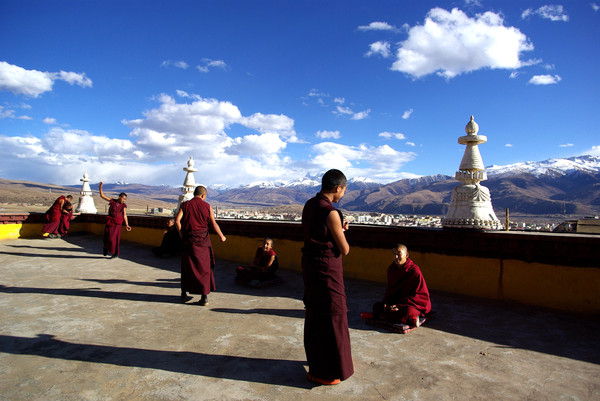这三个寺庙组成的觉囊文化中心规模宏达,各类寺院建筑鳞次栉比,诵经之声不绝于耳。我们进入每一个寺庙,遇见每一位喇嘛,还有当地的村民,都带着友好的微笑。在壤塘的这一天,我们没有碰见任何其他的游客,似乎整个壤塘之行都是属于我们四个人。