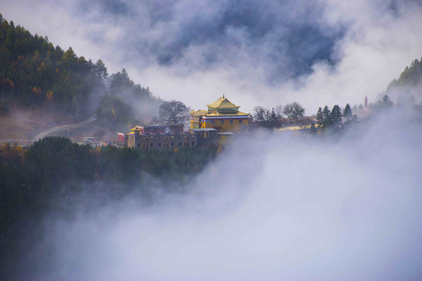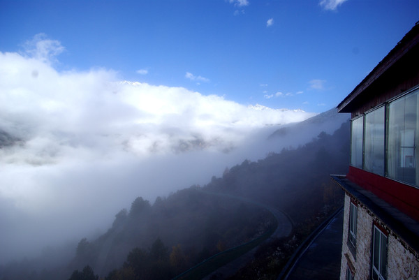 头顶上的云层正在逐渐退去露出了蓝天,左侧远方突然有巍峨的雪山从云雾中露出了一角,那冷峻的雪峰在阳光下熠熠生辉,而右侧的远方还是笼罩在云雾之中无法看清。最让人意想不到的是正对面这个位置,大约几百米开外与我们几乎同样高度的地方出现了一座横亘的山峰,一座金碧辉煌的寺庙在云雾缭绕的山顶上赫然显现。翻滚不停的云海时而把寺庙整个遮住,时而又把它下方的连绵不绝的森林掀起一角,这如梦似幻像海市蜃楼一般的景色美丽得让人怀疑自己的眼光。我们唯恐失去这美丽的一瞬间,兴奋得不停地摁动快门。