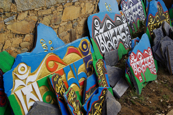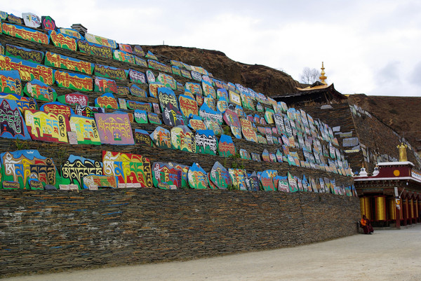 格日玛村的寺院有个高达十多米,全部是用一片片嘛呢石堆积而来的石墙,那个细密紧实的堆叠着实让人赞叹,也惊讶于雕刻这成千上万的石头是何等巨大的心血。嘛呢石,是刻有藏语经文或者六字真言的石头,常放在寺院,路边或山坡上。