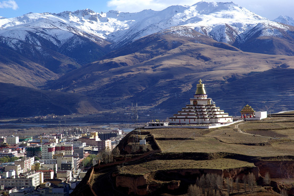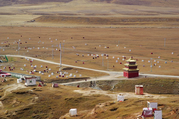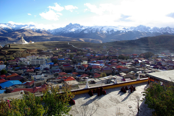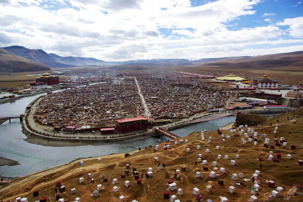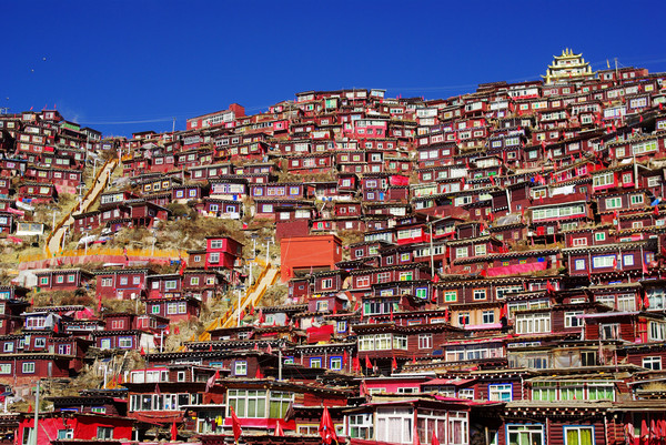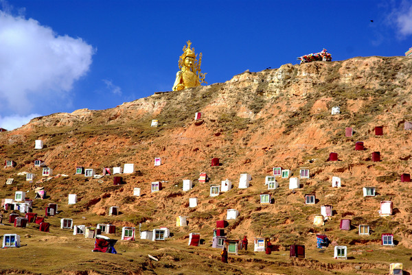 这条公交线路可以一直通到佛学院的最高处——坛城,道路蜿蜒曲折。您会途经佛学院大经堂,两旁是信众们搭建的无数绛红色小屋,数千名僧侣和觉姆们(藏传佛教的出家女子)就在这里过着清苦的修行生活,无论在何处都能听到连绵不断的诵经声。
