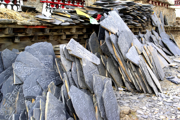 这次去藏区我想买一些有特色的礼物给朋友,不是那种任何地方都可以买到,几乎是物流配送化的牛肉干之类的东西。嘛呢石就是我期待的特别礼物,正巧看到路边有两位工匠正在那里雕刻着嘛呢石,所用的石料是就是那个墨石公园出产的墨石,我在这里买了三块嘛呢石,价格实在是平易近人。那位叫呷玛的工匠一再叮嘱我,这刻有经文的石头一定要放在最庄重的位置,如果在车上一定不要被其它东西压住。
