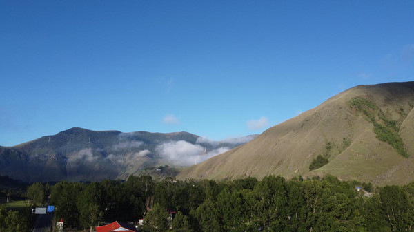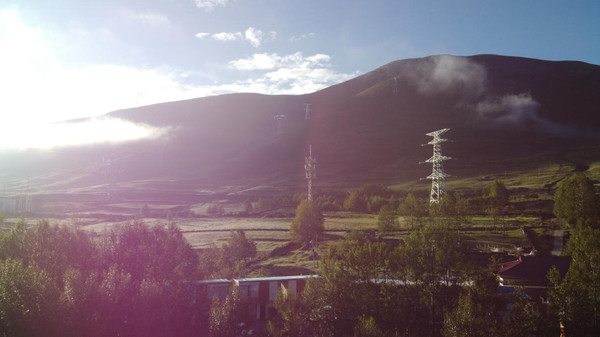 早上从营地上空拍摄的新都桥,山边有薄雾。