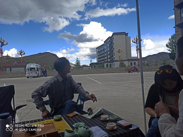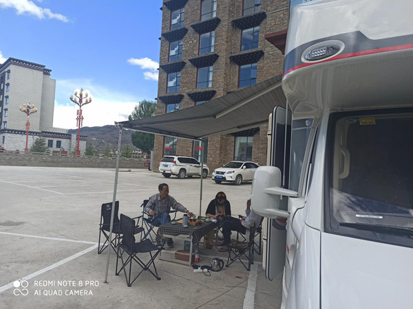 下午到达稻城,这时的蓝天白云非常美,随着刘大叔带来的汕头好茶叶,我们在酒店的停车场把房车展开,户外桌凳摆起,烧起开水开始下午茶了。
