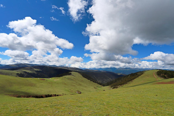 过路卡子拉山口后,沿途都是天路,一路穿行在高原的山脊上,两旁是松林和高山草原,牦牛成群,从山顶看去,牦牛就行散落在草原上的黑珍珠。