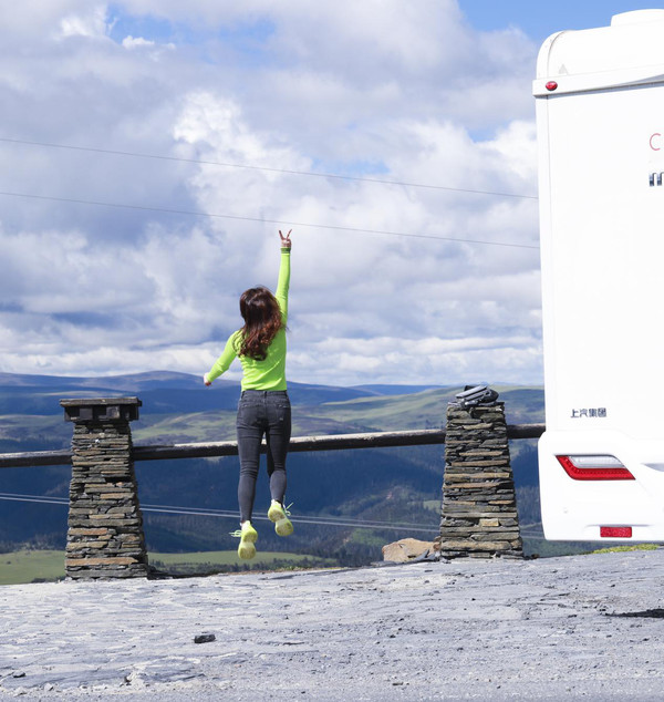 站在房车上打个招呼。