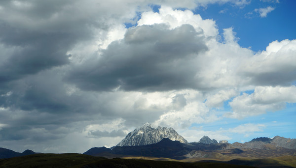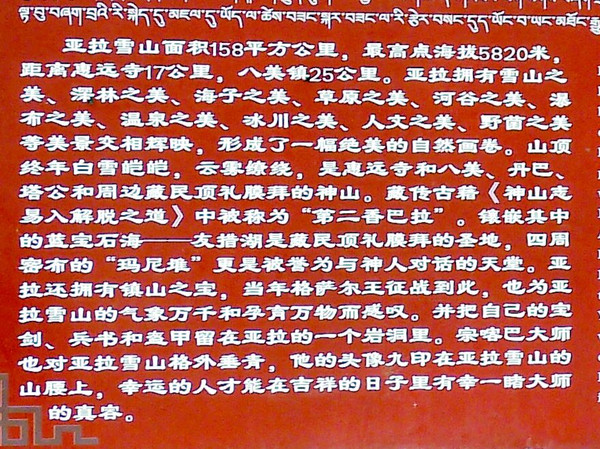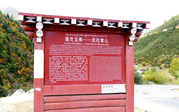 再向前行,海拔逐渐升高,我们驶出了山谷,视野也变得开阔。12:43看到左手路边有条不起眼的下坡岔道,路标显示“雅拉雪山”入口,我们疾驰而过。随后的道路就开始绕山爬坡,大约5分钟后驶抵“雅拉雪山”观景台。雅拉雪山冰清玉洁,十分清晰地出现在我们眼前,这座雪山在藏文古籍中被称作“第二香巴拉”,它是康巴藏区非常著名的一座神山。