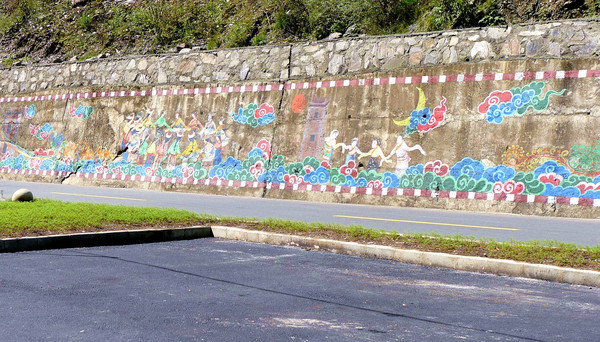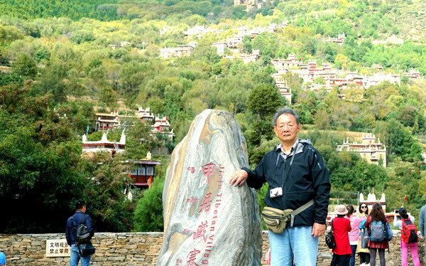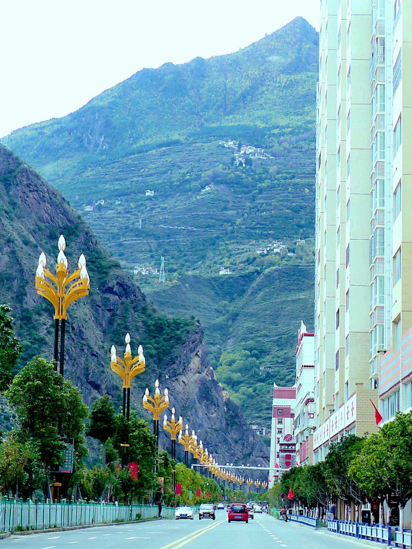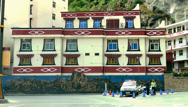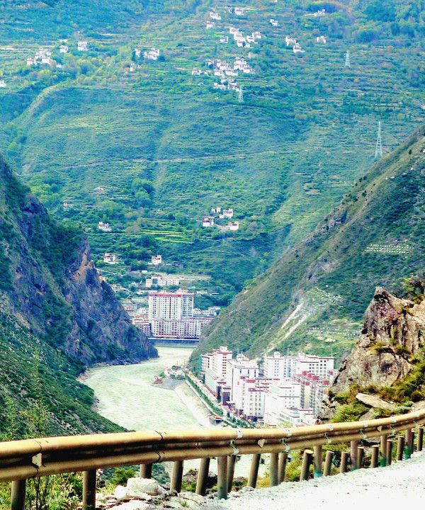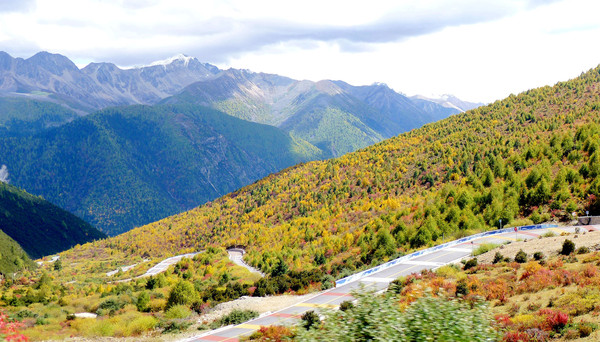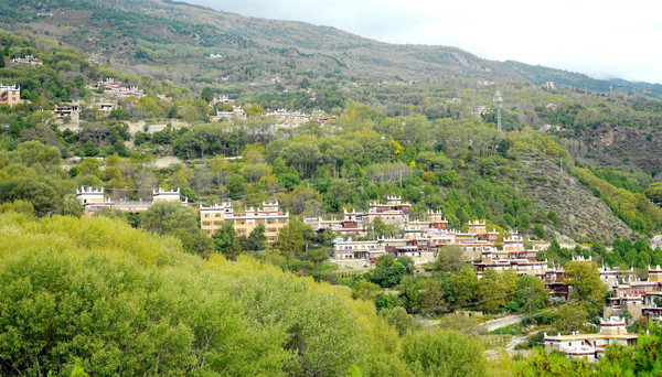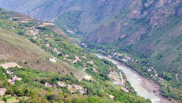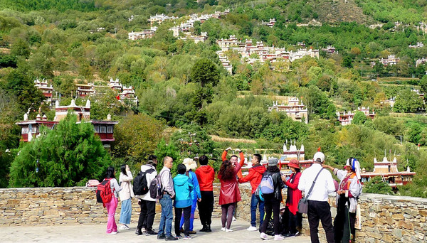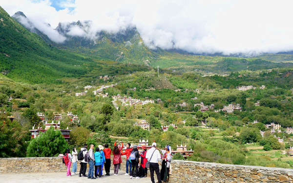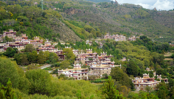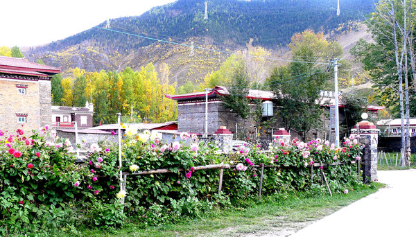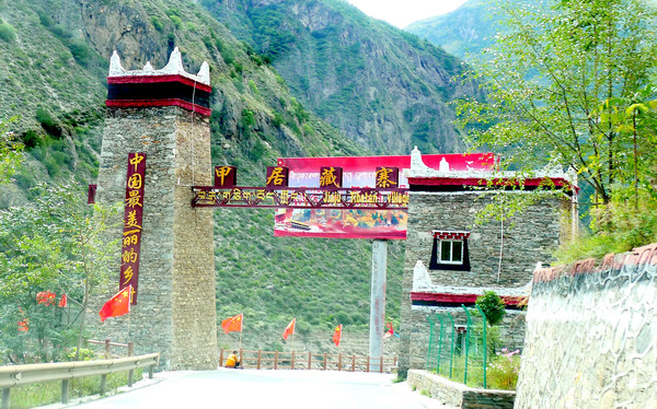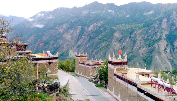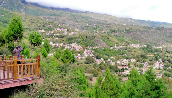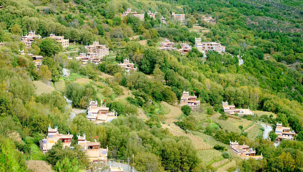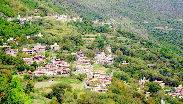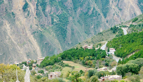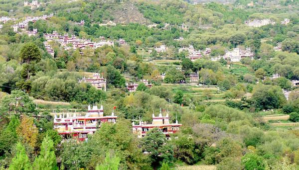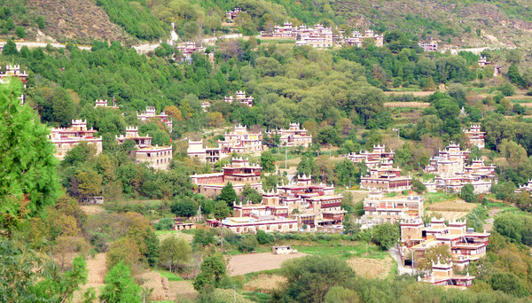 9:50退房、开车下山,甲居藏寨景区共设六座观景台,全都是构筑在下山公路的沿线。站在观景台上眺望,引入眼帘的主要景观是一大面倾斜的山坡,从低处的大金川河谷一直向上延申,直抵高高的山脊。一幢幢色彩艳丽的藏式小楼,依山就势散落在山坡之上,隐藏在绿树丛中。藏楼均为木、石建造,木制的廊柱、门窗被涂成赤、褐或是黄色,石块垒砌的墙壁表面刷成雪白,在绿荫之中格外醒目。